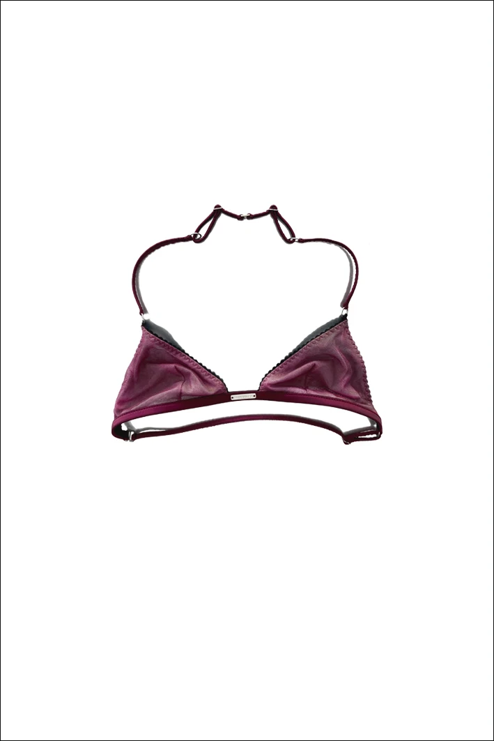 – Halter bralette made up of two different layers tulle: nude/black polyamide, inside, and bordeaux-red silk tulle, outside.