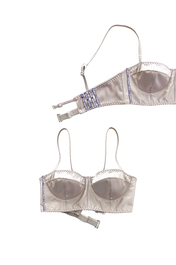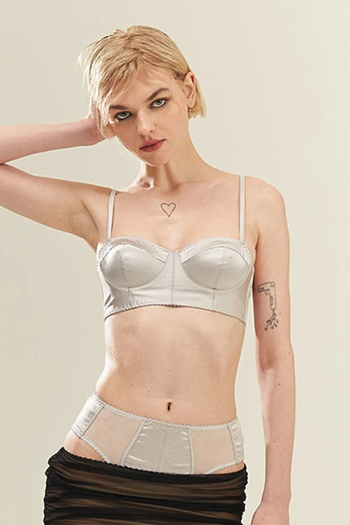 – Liquid ice-white satin bustier.